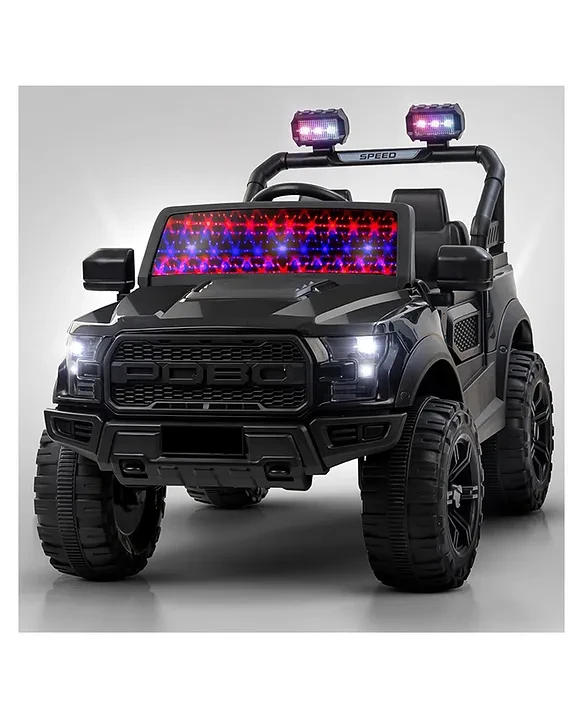 Product Description: Battery operated ride on electric jeep for kids. This jeep can be operated manually and also with remote. Jeep comes with music system compatible with aux, pen drive and SD card. In their early years kid can sit in the jeep car and parents can control it through Bluetooth remote as kids grow they can ride it manually using foot accelerator. This jeep is operated with 2 batteries and 2 motors. Ride on jeep will run at a speed of 4-5km/hr. Kid will ride it on any flat surface. This jeep is made up of non toxic plastic and very safe for kids to drive.